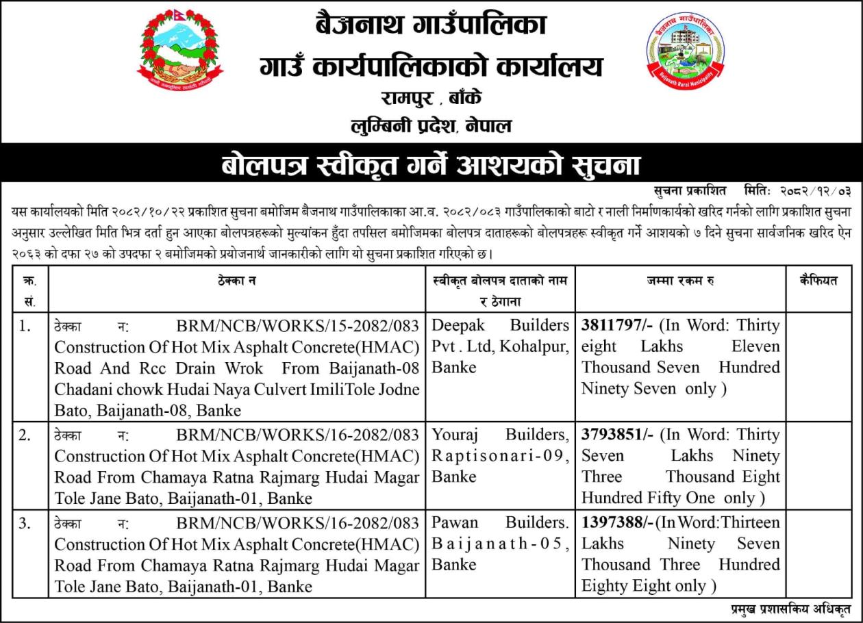 » आशयको सूचना (Construction of HMAC Road and RCC Drain Work from Baijanath-8 Chadani Chowk hudai Naya Culvert ImiliTole ...)