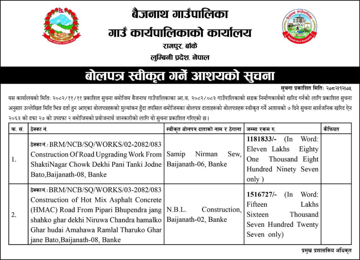 आशयको सूचना (Construction of Road upgrading from shaktinagar... )