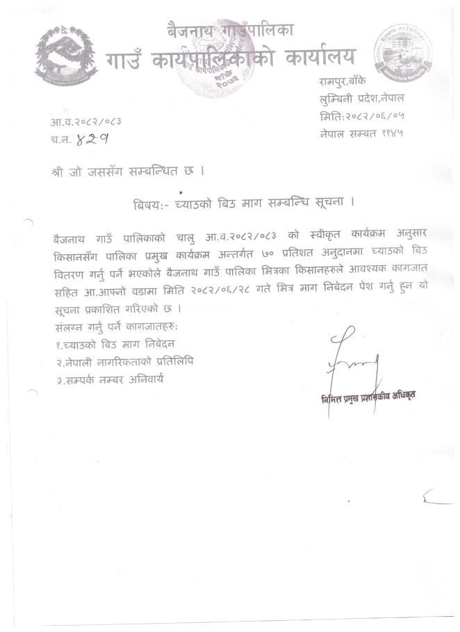 कृषि यान्त्रिकरण ७० % अनुदानमा वितरण सम्बन्धी सूचना ।