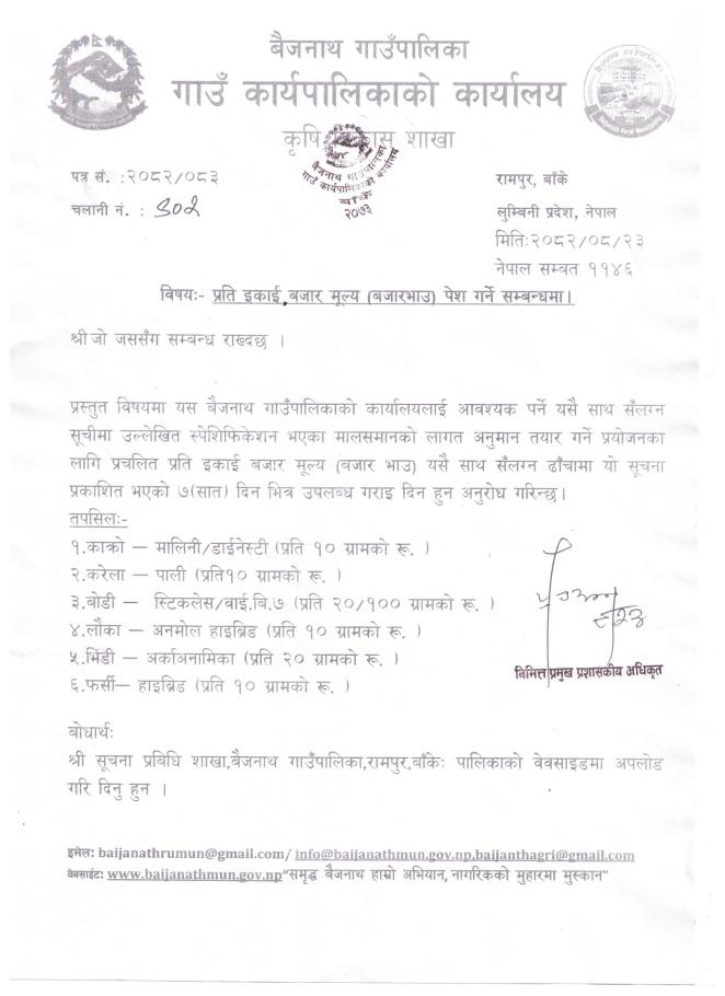 प्रति इकाई बजार मूल्य (बजारभाउ) पेश गर्ने सम्बन्धमा ।