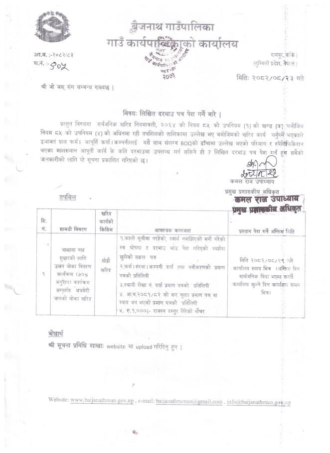 लिखित दरभाउ पत्र पेश गर्ने बारे - बाख्रामा नश्ल सुधारको लागि उन्नत अजमेरी जातको बोका वितरण )