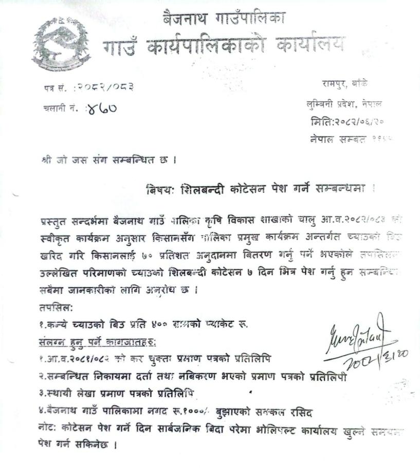 बिउ खरिद सम्बन्धि सिलबन्दी कोटेसन पेश गर्ने बारेको सूचना ।