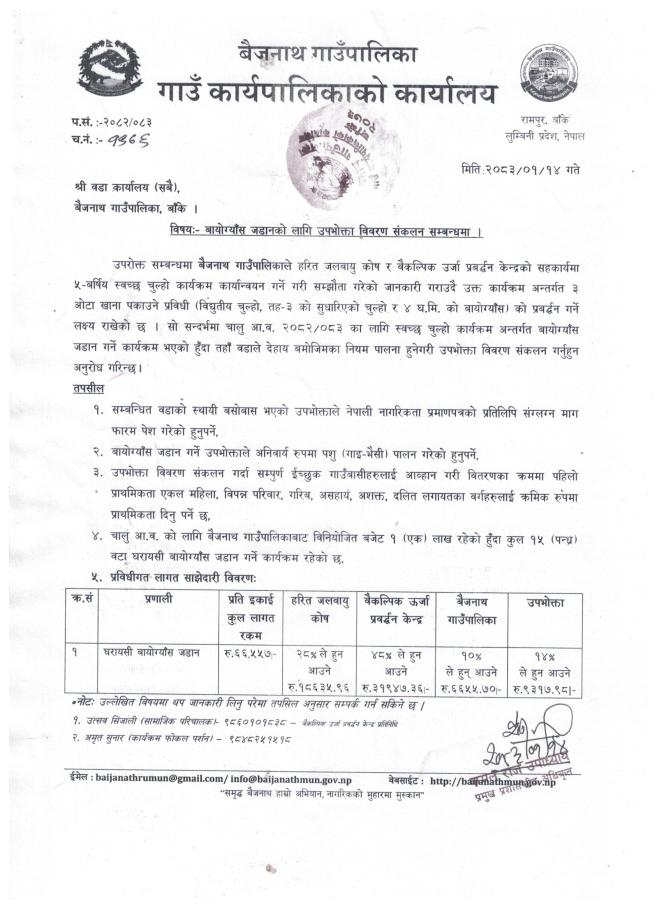 बायोग्यास जडानको लागि उपभोक्ता विवरण संकलन सम्बन्धमा ।