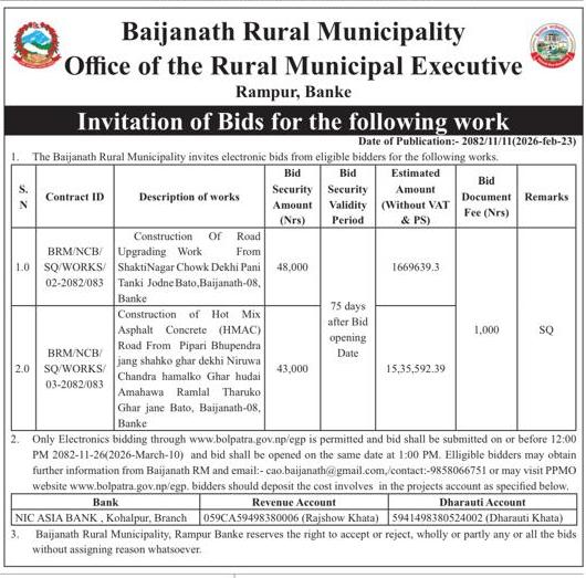 प्रस्ताव खोलिएको सम्बन्धी सूचना । (BlackTopped Road from Homepipe Nera ko Chowk Dekhi & Ramnagar Dekhi Sutiya Bich Bato)