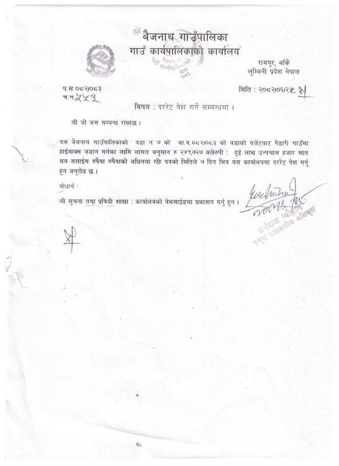 लिखित दरभाउ पेश गर्ने बारे सूचना । (सडक, मर्मत सम्भार, सिचाई डयाम)