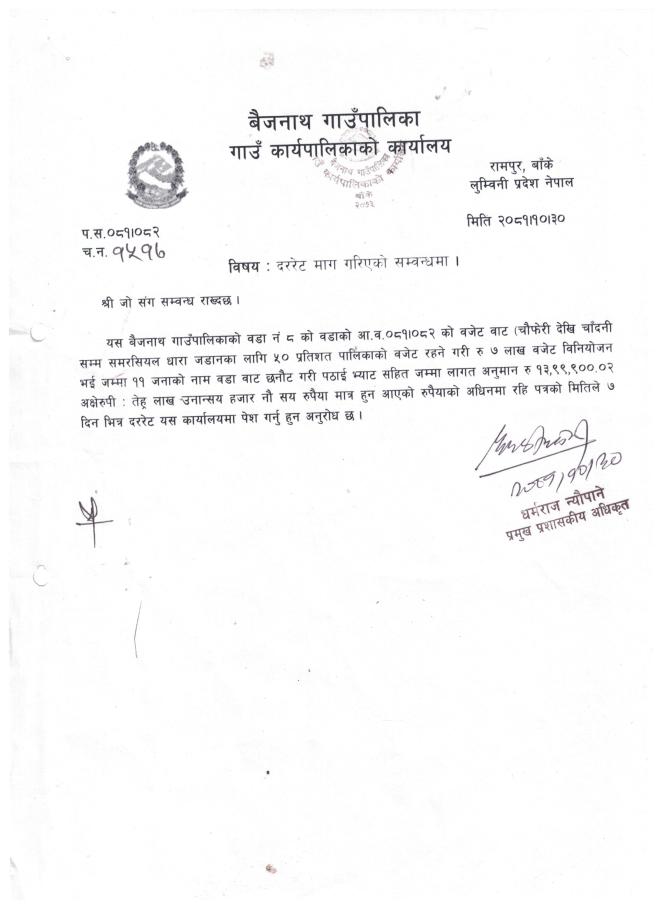 लिखित दरभाउ पत्र पेश गर्ने बारे सूचना । । (भुमि इकाईको पार्टेसन तथा मर्मत गर्न)।