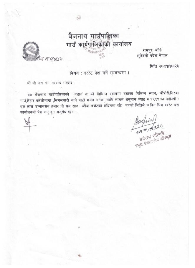 लिखित दरभाउ पत्र पेश गर्ने बारे सूचना । । (भुमि इकाईको पार्टेसन तथा मर्मत गर्न)।