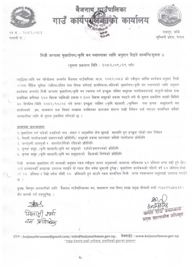 निजी जग्गामा वृक्षारोपण/कृषि वन स्थापनाका लागि अनुदान दिइने सम्बन्धी सूचना ।