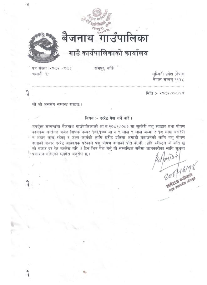 दररेट पेश गर्ने सम्बन्धमा । (cow mat)