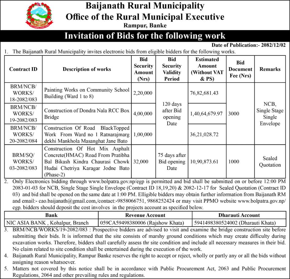 » प्रस्ताव आव्हान सम्बन्धि सूचना । (Painting works, construction dondra naala, black topped road and hmac) )