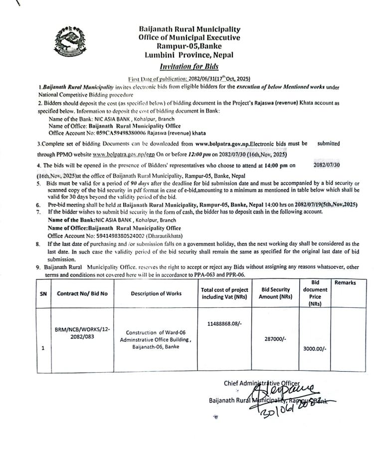 प्रस्ताव आव्हान सम्बन्धि सूचना ।(construction of ward 6 administrative office building)