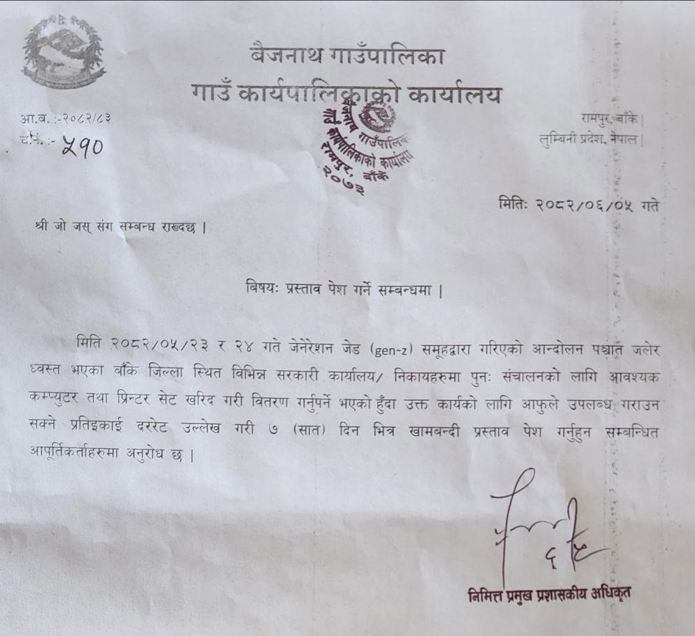 प्रस्ताव पेश गर्ने सम्बन्धमा (विभिन्न सरकारी निकायहरु पुनः संचालन गर्न आवश्यक कम्प्युटर तथा प्रिन्टर खतिद)