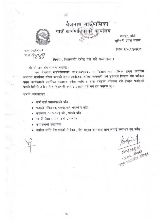 लिखित दरभाउ पत्र पेश गर्ने बारे - बाख्रामा नश्ल सुधारको लागि उन्नत अजमेरी जातको बोका वितरण )