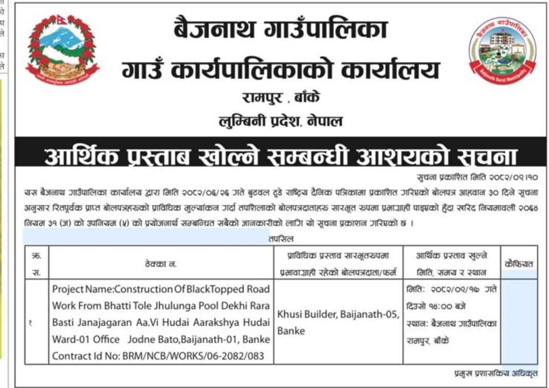 » आर्थिक प्रस्ताव खोल्ने सम्बन्धि आशयको सूचना !