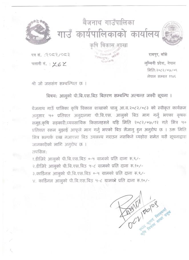 आलुको पी.बि.एस बिउ वितरण सम्बन्धी सूचना ।