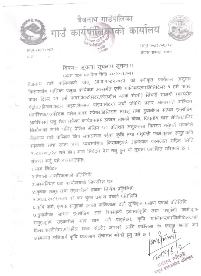 कृषि यान्त्रिकरण ७० % अनुदानमा वितरण सम्बन्धी सूचना ।