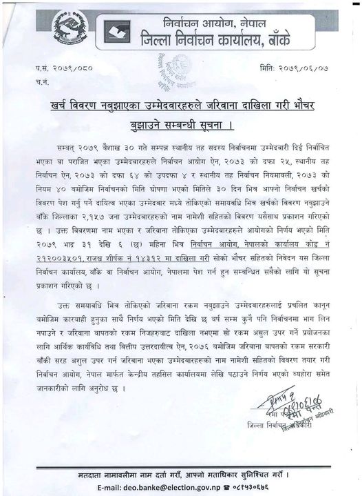 खर्च विवरण नबुझाएका उम्मेदवारहरुले जरिवाना दाखिला गरी भौचर बुझाउने सम्बन्धी सूचना!!