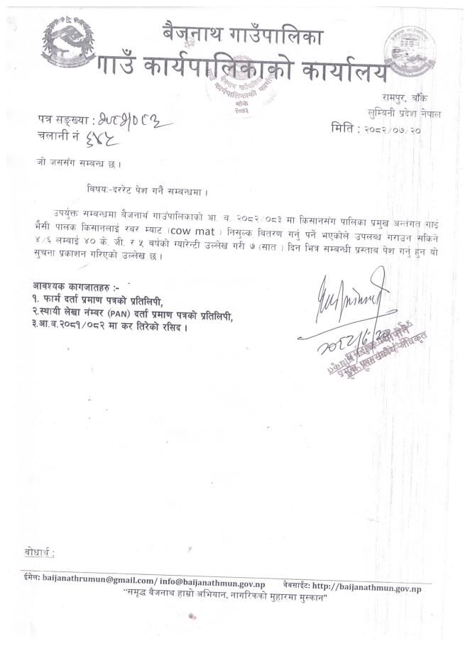 दररेट पेश गर्ने सम्बन्धमा । (cow mat)