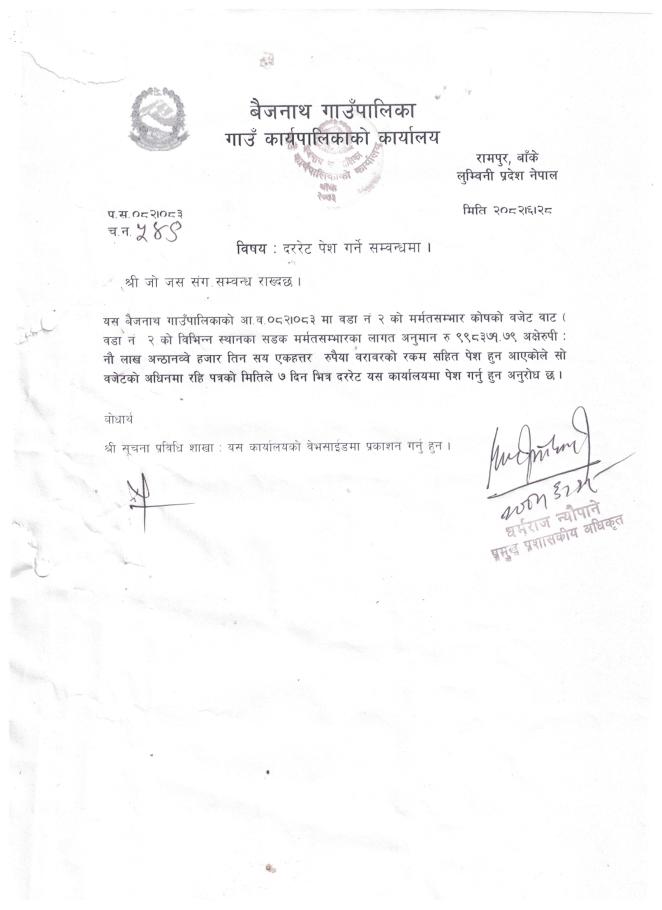 दररेट पेश गर्ने सम्बन्धी ७ दिने सूचना (वडा नं. २ को विभिन्न स्थानका सडक मर्मतसम्भार)।