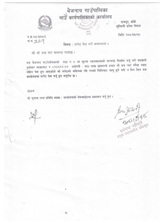 प्रस्ताव आव्हान सम्बन्धि सूचना ।(रामनगर देखि सुतैया बैजनाथ ३)