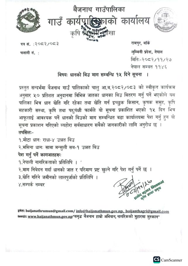 » धानको बिउ माग सम्बन्धि १५ दिने सूचना ।