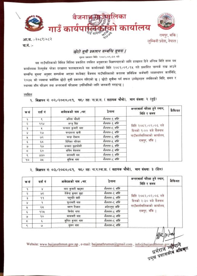 » ना प्रा स (सहायक चौथो), ना प स्वा प्रा (सहायक चौथो) र स क अ (सहायक चौथो) पदहरुको छोटो सूची प्रकाशन सम्बन्धि सूचना ।