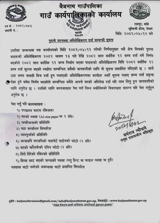 पुरानो घरनक्सा अभिलेखिकरण दर्ता सम्बन्धी सूचना