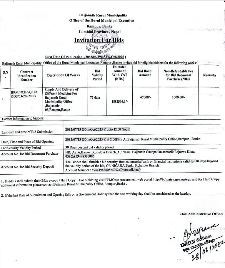 प्रस्ताव आव्हान सम्बन्धि सूचना (supply and delivery of different medicine)