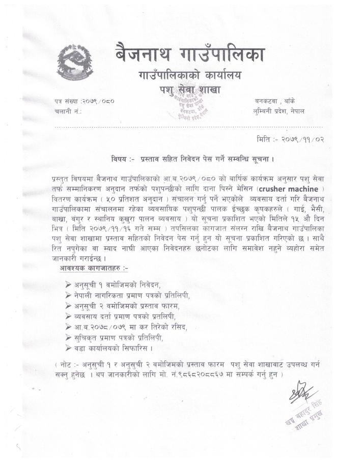 राष्ट्रिय कृषि आधुनिकीकरण कार्यक्रमको लाभग्राही छनौट नतिजा प्रकाशन सम्बन्धी सूचना ।