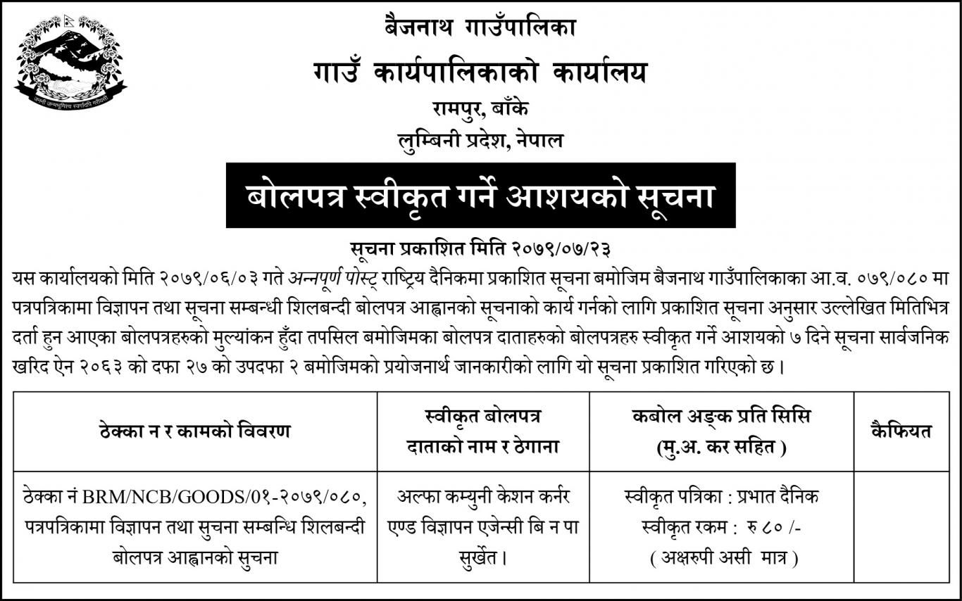 बोलपत्र स्वीकृत गर्ने आशयको सूचना ।।