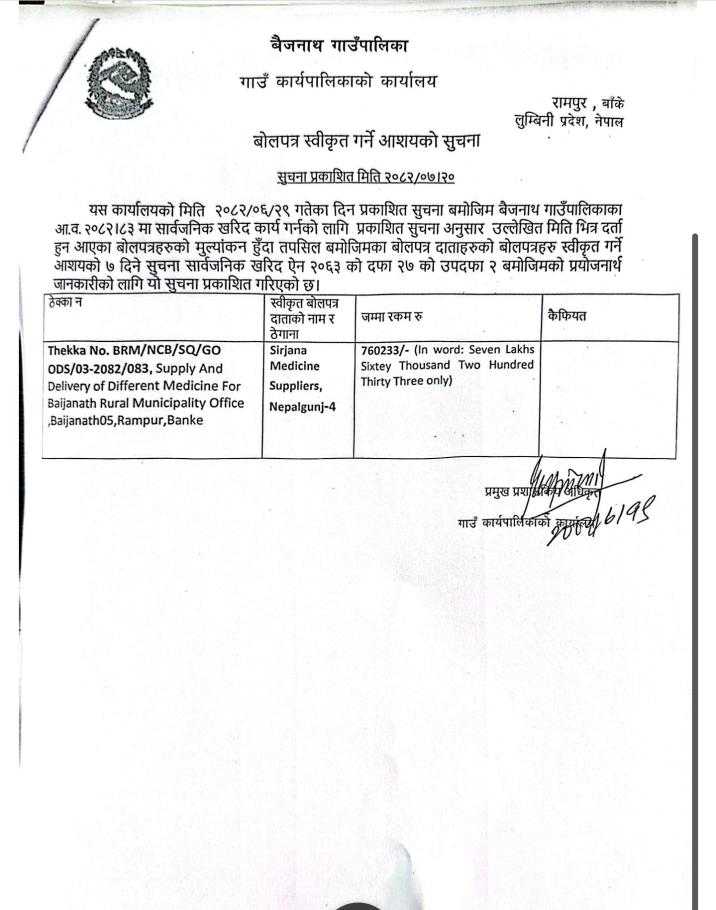 बोलपत्र स्वीकृत गर्ने आशयको सूचना (supply and delivery of different medicine for BRM...)