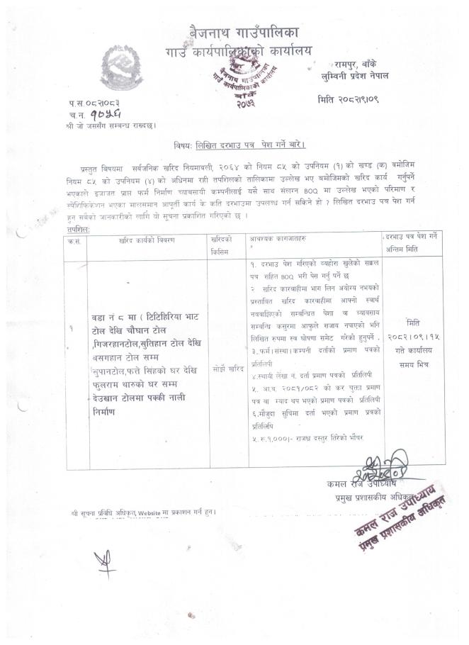 लिखित दरभाउ पत्र पेश गर्ने बारे - (वडा नं. ८ मा भाट टोल देखि चौघान टोल.... पक्कि नाली निर्माण)