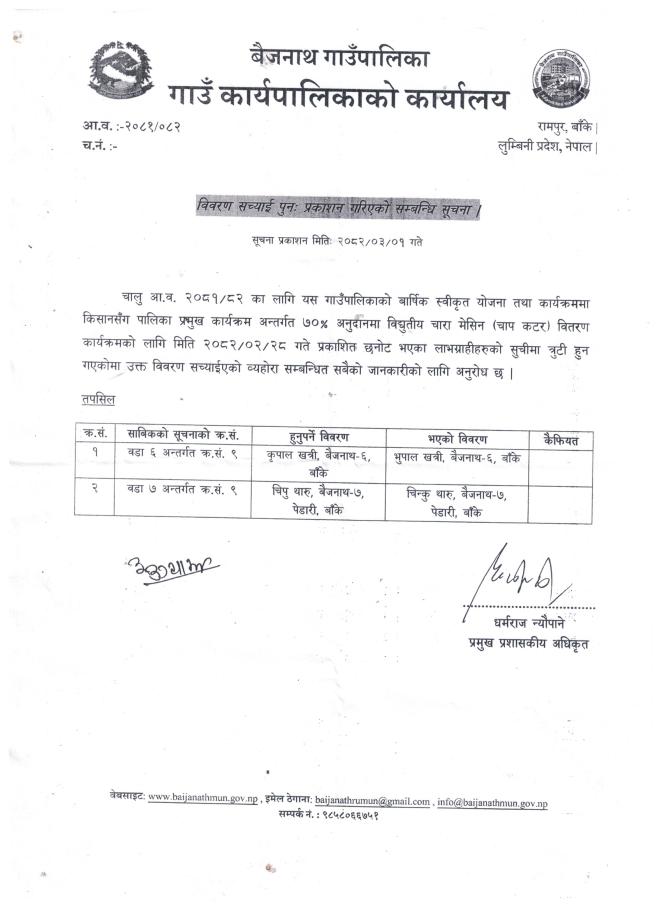 विवरण सच्याई पुनः प्रकाशन गरिएको सम्बन्धी सूचना ।