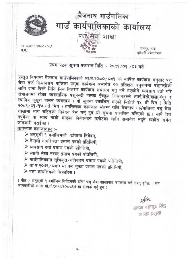» व्यवसाय दर्ता गरी संचालनमा रहेका व्यवसायिक पशुपन्छी पालक ईच्छुक किसानहरुले निवेदन पेश गर्ने सम्बन्धी सूचना ।