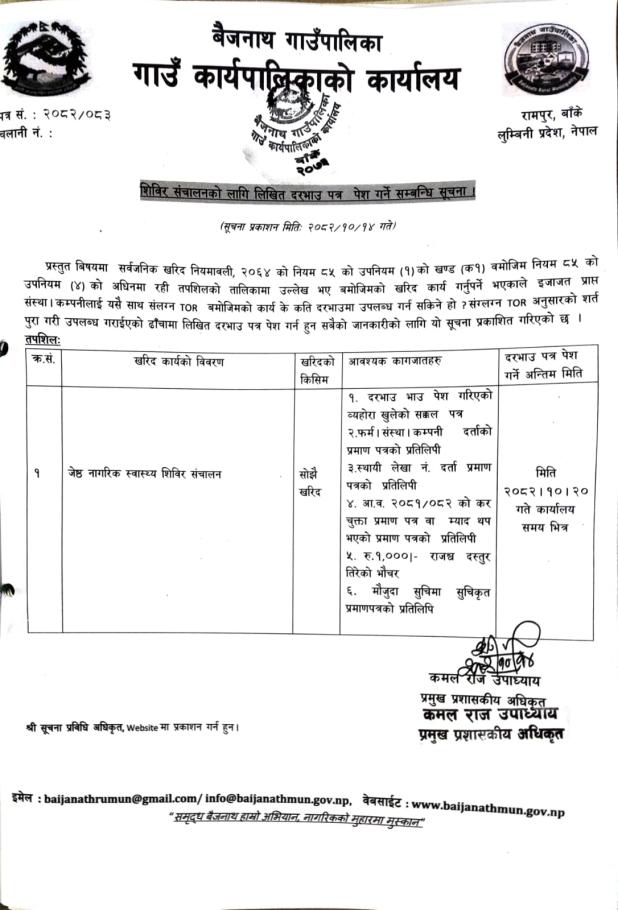 शिविर संचालनको लागि लिखित दरभाउ पत्र पेश गर्ने सम्बन्धि सूचना ।