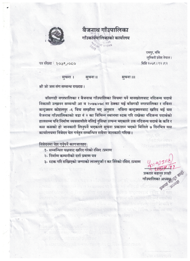 प्रस्ताव आव्हान सम्बन्धि सूचना ।(रामनगर देखि सुतैया बैजनाथ ३)