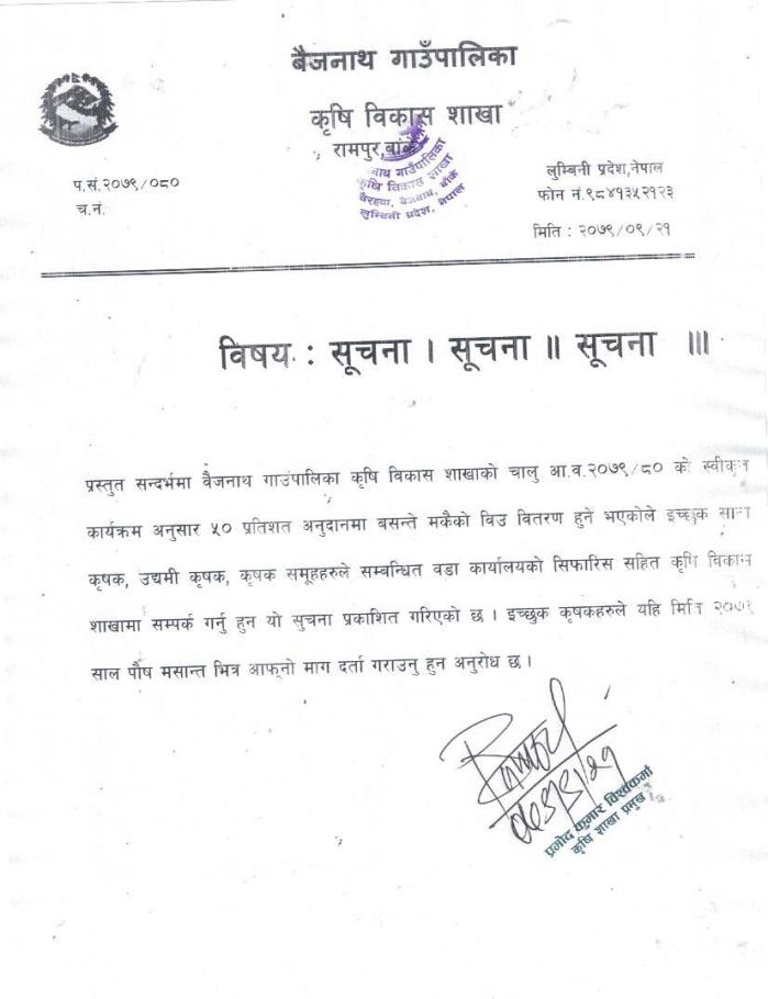 राष्ट्रिय कृषि आधुनिकीकरण कार्यक्रमको लाभग्राही छनौट नतिजा प्रकाशन सम्बन्धी सूचना ।