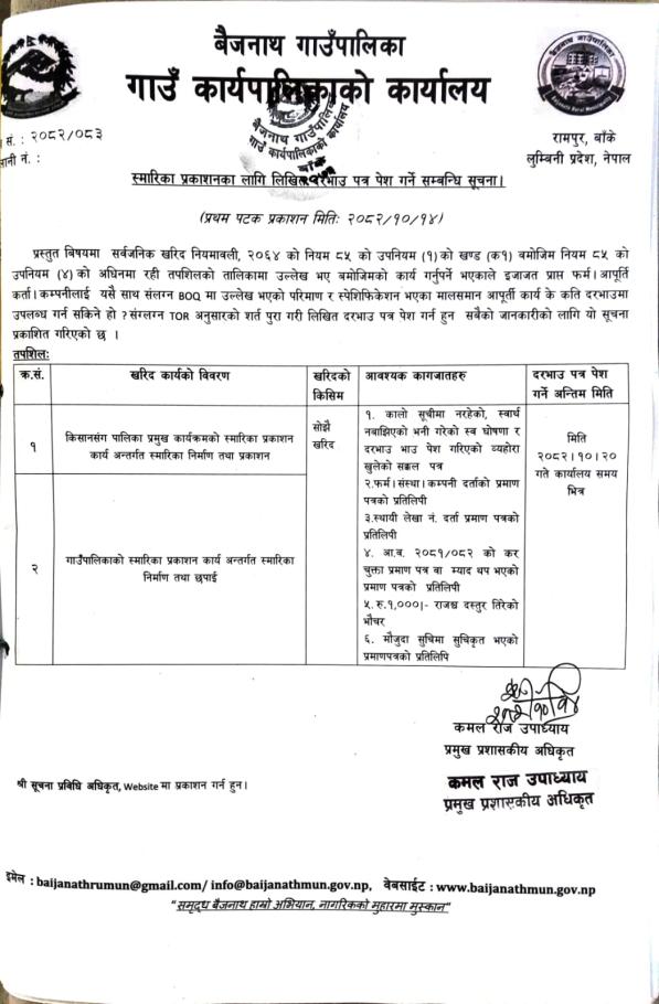 » स्मारिका प्रकाशनका लागि लिखित दरभाउ पत्र पेश गर्ने सम्बन्धी सूचना ।
