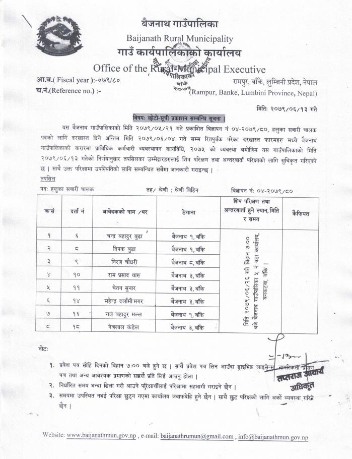 हलुका सवारी चालकको छोटो सूची प्रकाशन सम्बन्धी सूचना ।