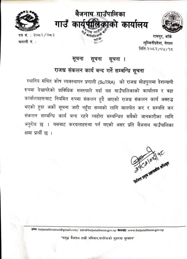 हाल SUTRA प्रणालीको राजश्व मोड्युलमा देखिएको प्राविधिक समस्याका कारण प्रणाली अवरुद्ध भएकोले उक्त प्रणाली सुचारु भए पश्चात मात्र राजस्व संकलन कार्य हुने व्यहोरा सबैमा सुचित गरिन्छ ।
