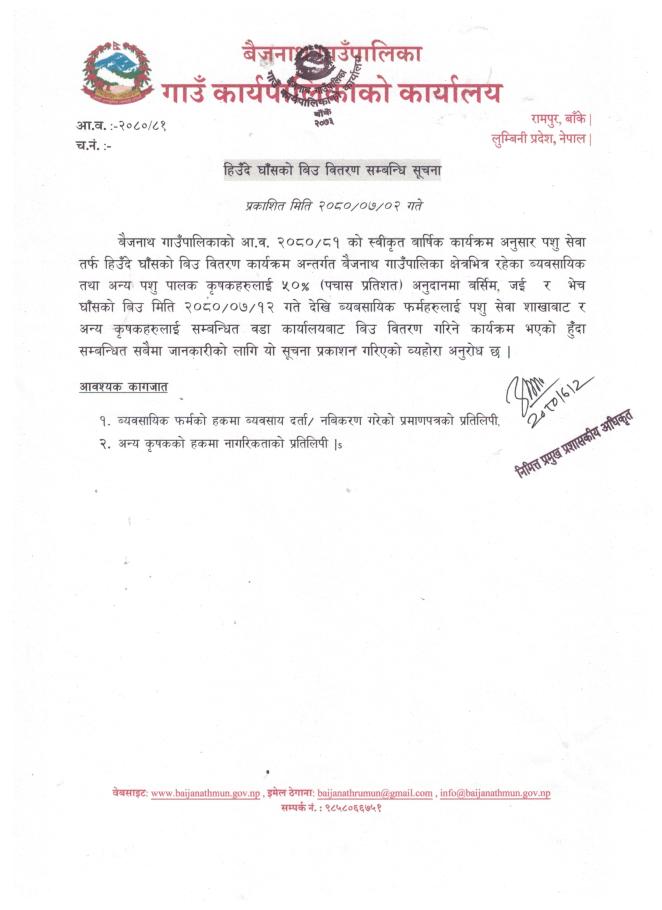 हिउँडे घाँसको बिउ वितरण सम्बन्धि सूचना ।